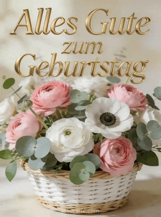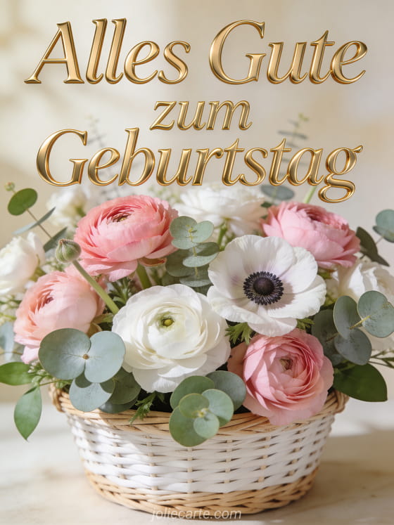 Feiern Sie eine besondere Frau mit dieser fotorealistischen Geburtstagskarte mit eleganten goldenen Buchstaben und einer luxuriösen Blumenkomposition mit rosa Ranunkeln, weißen Anemonen und Eukalyptus im Weidenkorb. Entdecken Sie auch eine kostenlose Geburtstags-Gif für Frauen oder eine kostenlose Geburtstags-Gif für Frauen.