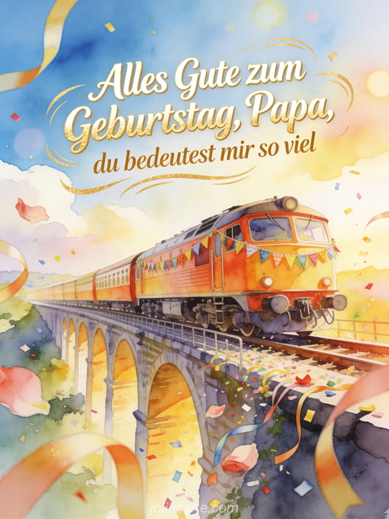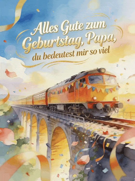 Sende einen Geburtstagsbrief für seinen Papa mit leuchtender elfenbeinfarbener Schrift, einem hellen Vintage-Zug mit Wimpeln auf einem sonnigen Viadukt, dazu Bänder, Blüten und Konfetti über dem Rand. Entdecke auch eine Alles Gute zum Geburtstag Stiefpapa Karte, Papa ich wünsche dir alles Gute zum Geburtstag oder eine Alles Gute zum Geburtstag Papa Karte.