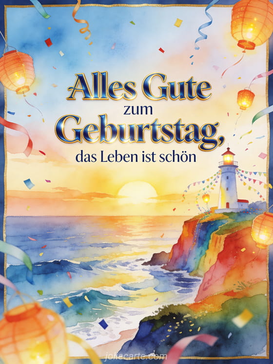 Sende einen fröhlichen Geburtstagsgruß mit einem hellen Leuchtturm auf farbigen Klippen über dem Meer. Girlanden, leuchtende Laternen und Konfetti rahmen einen strahlenden Aquarell-Sonnenaufgang und die Botschaft, dass das Leben schön ist. Entdecke auch berührender Text zum Geburtstag meines Sohnes, gedicht zum geburtstag meines sohnes oder Geburtstagsgedicht für meinen Sohn.