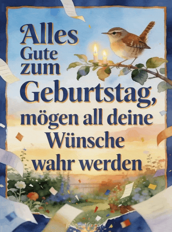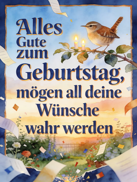 Sende einen poetischen Geburtstagswunsch mit einem Zaunkönig auf einem belaubten Zweig, leuchtenden Kerzen und einem Aquarellgarten im Morgenlicht. Schleifen und Konfetti machen die Szene festlich und hell. Entdecke auch Alles Gute zum Geburtstag mein erwachsener Sohn, eine kostenlose geburtstagskarte erwachsener sohn oder eine karte mein sohn geburtstagskarte erwachsener sohn.