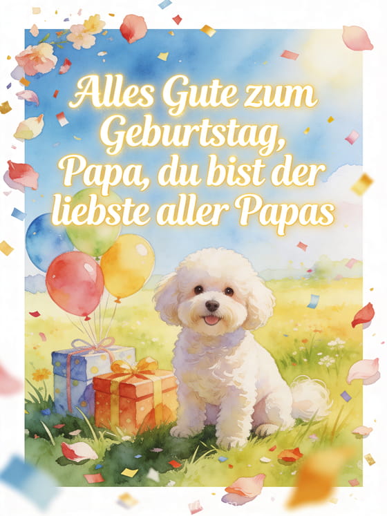 Teile ein Geburtstagsgedicht für Papa von einem Kind mit einem Bichon Frisé Hund auf einer hellen Wiese neben Geschenken und Geburtstagsballons. Dazu passen geburtstagsgedicht für papa, geburtstagstext für deinen papa oder alles gute zum geburtstag papa gif.