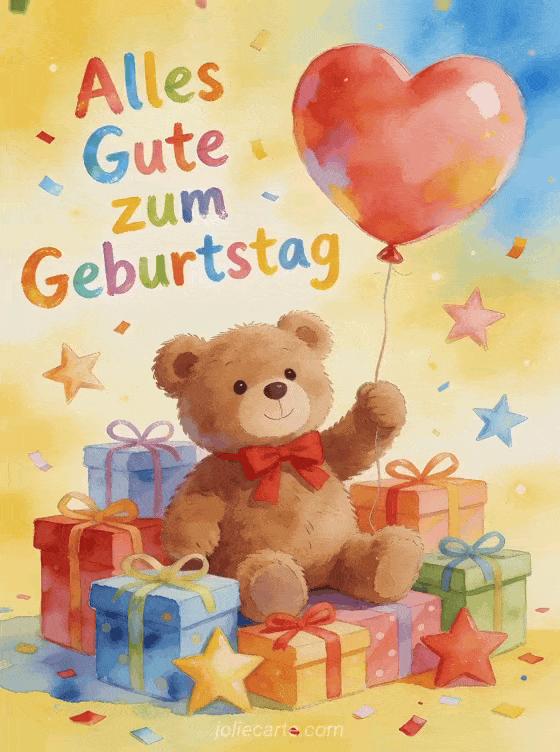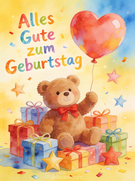 Kostenlose Geburtstagskarte mit Teddybär und Geschenken