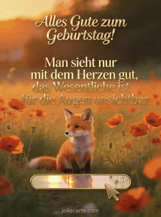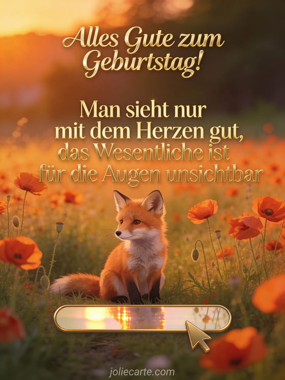 Sende einen wunderschönen Geburtstagsgruß, der das Herz berührt. Ein kleiner Fuchs im Mohnblumenfeld begleitet diese zarte Botschaft. Entdecke auch eine Geburtstagsnachricht zum Schreiben oder einen kurzen Gruß zum Geburtstag.