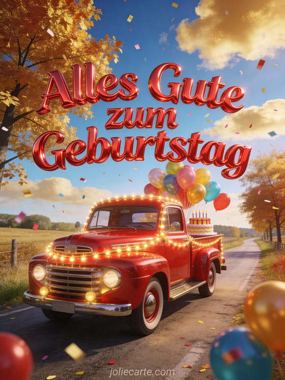 Feiere mit dieser Geburtstagskarte alles Gute LKW mit einem glänzenden roten Vintage-Lastwagen, geschmückt mit Lichterketten und Ballons auf einer Landstraße, mit Geburtstagskuchen hinten und Konfetti am Himmel. Entdecke auch alles gute zum geburtstag freundin bild, Freundschaft alles Gute Freundin und Geburtstag beste Freundin.