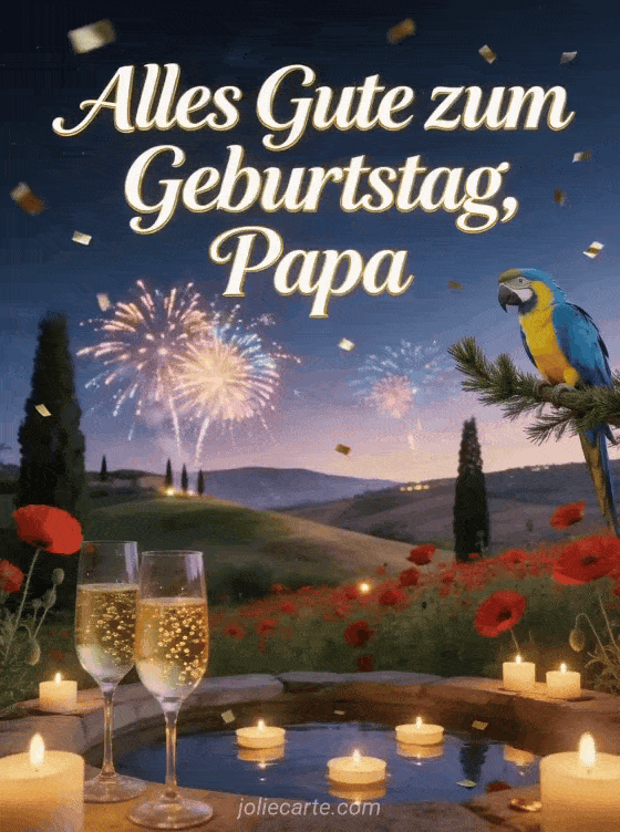 Sende eine Geburtstagskarte alles Gute zum Geburtstag Papa mit eleganter weißer und goldener Schrift, toskanischen Hügeln mit Mohnblumen und Zypressen, Feuerwerk, einem Ara-Papagei, schwimmenden Kerzen und Champagnergläsern. Entdecke auch einen Geburtstagsbrief für seinen Papa, eine Alles Gute zum Geburtstag Stiefpapa Karte oder Papa ich wünsche dir alles Gute zum Geburtstag.