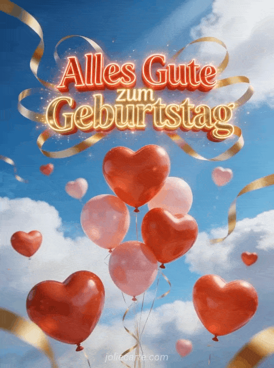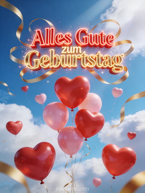 Senden Sie diese festliche animierte Geburtstags-GIF-Karte mit roten und rosa Herzballons, goldenen Bändern und fröhlicher Atmosphäre. Entdecken Sie auch das Geburtstag GIF animiert für Frauen oder die Alles Gute zum Geburtstag Karte mit Blumenstrauß.