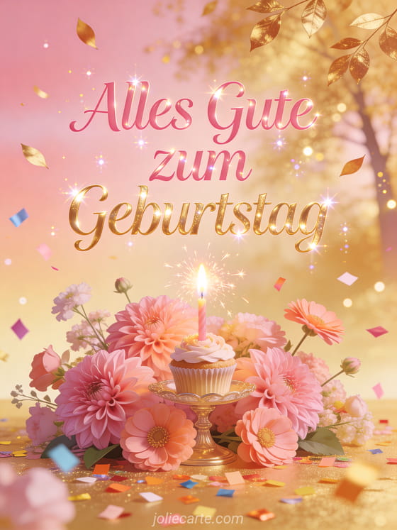 Feiere mit dieser Geburtstagskarte Frau animiert kostenlos musikalisch im üppigen Blumenstil mit rosa Dahlien, pfirsichfarbenen Ranunkeln, Konfetti, goldenen Blättern und funkelnder Cupcake-Kerze. Entdecke auch Geburtstagskarte Frau Humor animiert, humor alles gute zum geburtstag frau und herzlichen glückwunsch zum geburtstag frau.