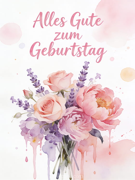 Überraschen Sie eine besondere Frau mit dieser Geburtstagskarte in Aquarell, mit Rosen, Pfingstrosen und Lavendel in Pastelltönen. Entdecken Sie auch eine Geburtstagskarte Frau mit Blumen, ein Bild Alles Gute zum Geburtstag Frau mit Blumen oder eine Geburtstagsblumenkarte für Frauen.