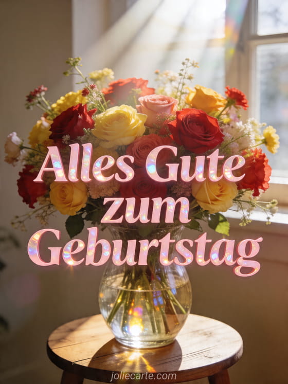 Teile mit dieser fotorealistischen Karte mit großem Blumenstrauß in einer Glasvase im Sonnenlicht einen sanften Geburtstagsgruß. Entdecke auch kostenloses lustiges frau geburtstag gif, frau geburtstag foto oder Geburtstag Frau humorvoll.