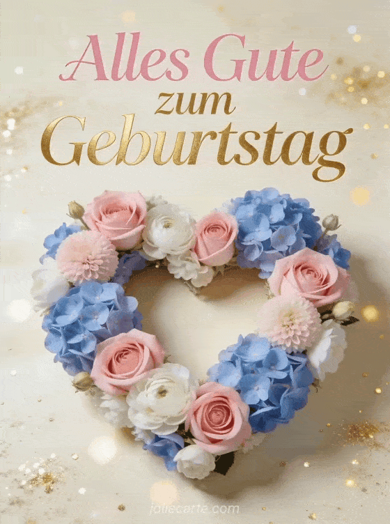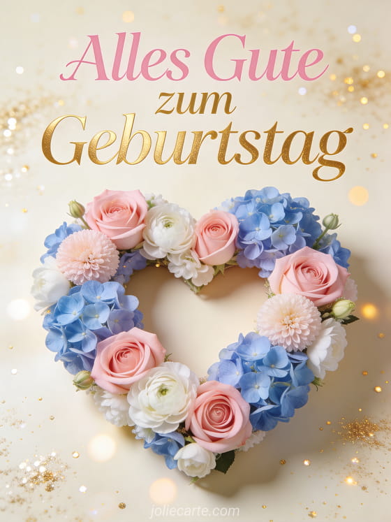 Teile einen feinen Geburtstagsgruß mit rosa-goldener Schrift, einem herzförmigen Blumenarrangement aus Rosen, Hortensien und Ranunkeln, auf cremefarbenem Hintergrund mit goldenen Funken. Du kannst auch eine kostenlose und animierte Geburtstagskarte für Frauen, eine Karte für geburtstag frau natur oder eine geburtstagskarte frau blumenstrauß senden.