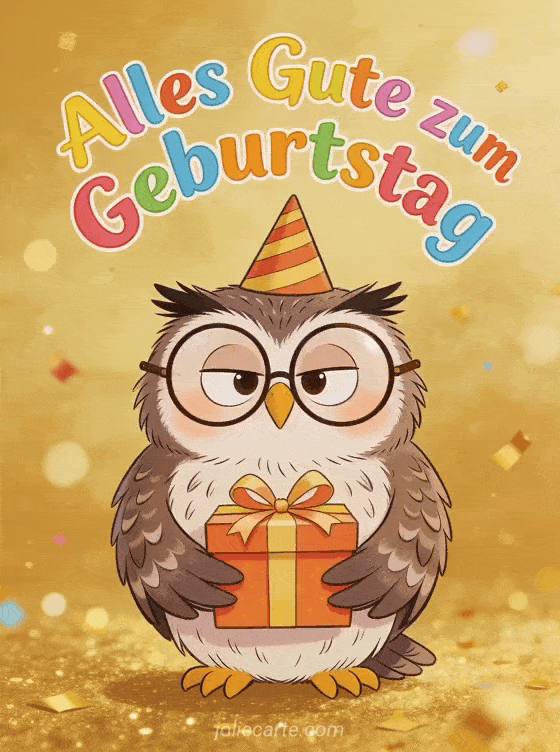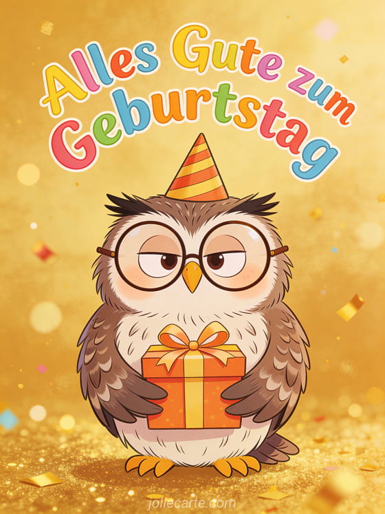 Schicke eine lustige Geburtstagskarte mit einer Schleiereule mit großen runden Brillen und Partyhut, die ein eingepacktes Geschenk hält. Entdecke auch einen Geburtstagsgruß für Frauen oder eine elegante Geburtstagskarte für Frauen.