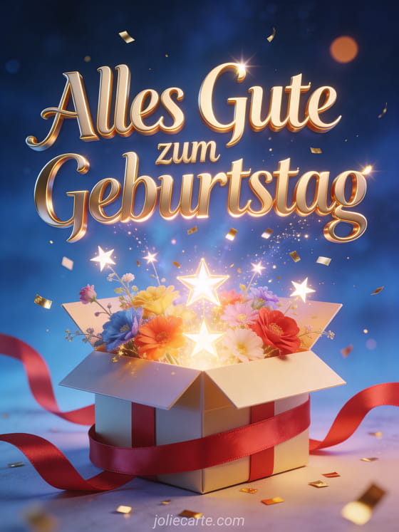 Feiere Mama mit einer eleganten Geburtstagskarte voller leuchtender Geschenkbox, bunter Blumen, goldenem Konfetti und fröhlicher Überraschungsstimmung. Entdecke auch eine Karte mit einfache Zeichnung für Mamas Geburtstag, eine Karte mit Alles Gute zum Geburtstag an die eigene Mama oder eine Karte mit alles Gute zum Geburtstag an eine wunderbare Mama.