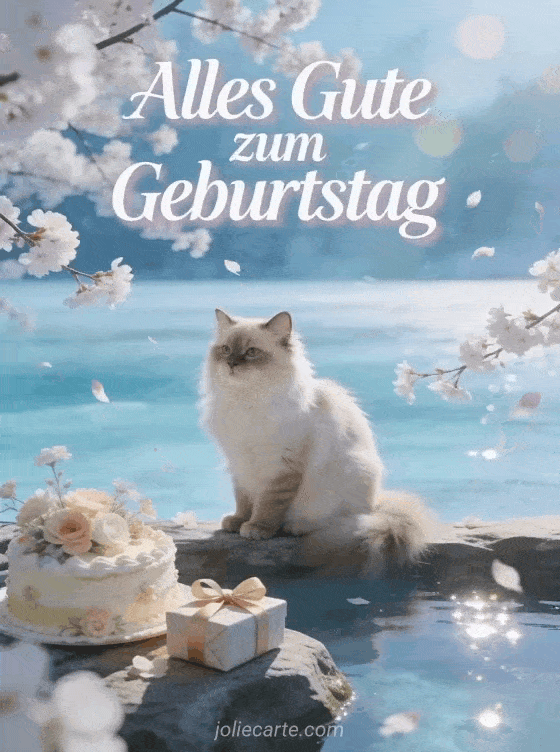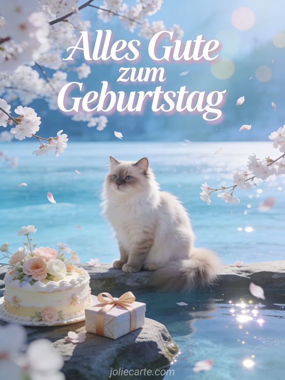 Senden Sie eine zärtliche Geburtstagskarte mit einer Türkisch-Angora-Katze an einem milchig blauen Gletschersee, Kirschblüten, einem mit Blumen dekorierten Kuchen und einem verpackten Geschenk. Dazu passen eine Brüderchen alles Gute zum Geburtstag mein Bruder gif Karte, eine alles Gute zum Geburtstag kleiner Bruder gif Karte oder eine Alles Gute zum Geburtstag kleiner Bruder Karte.