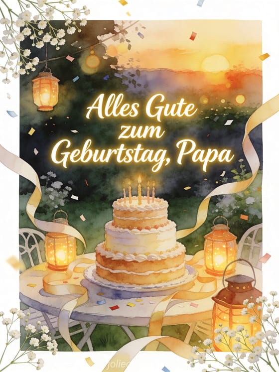 Teile eine Geburtstagskarte für Papa mit einem mehrstöckigen Geburtstagskuchen auf einem Gartentisch, umgeben von gedrehten Schleifen und leuchtenden Laternen. Dazu passen Gedicht Gedicht Papa alles Gute zum Geburtstag, Geburtstagsgedicht Papa für Kind oder geburtstagsgedicht für papa.