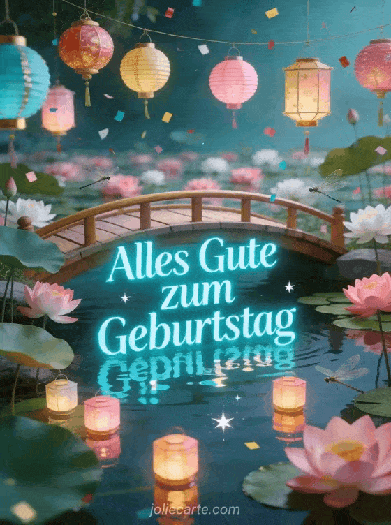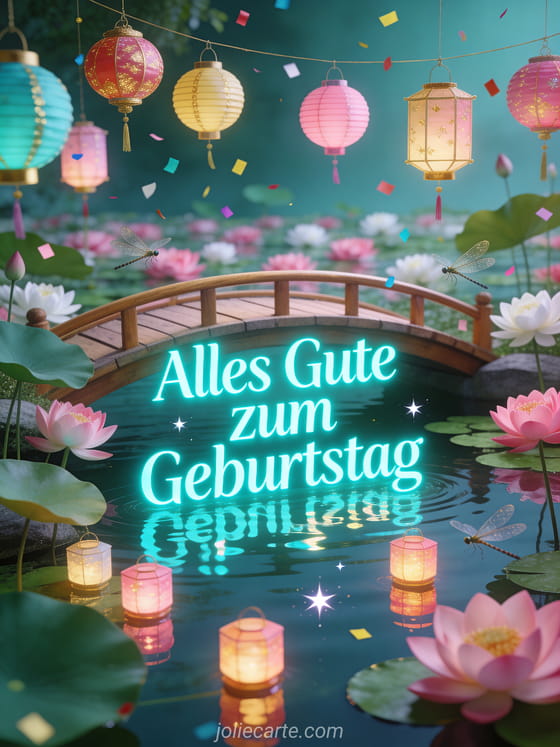 Senden Sie diese festliche und Zen Geburtstagskarte für Teenager mit einer Holzbrücke über einem Lotusteich, bunten Lampions und Reflexionen auf ruhigem Wasser. Entdecken Sie auch eine Karte Teenager Geburtstag junges Mädchen oder ein Geburtstagsbild Teenager Junge.