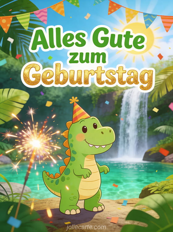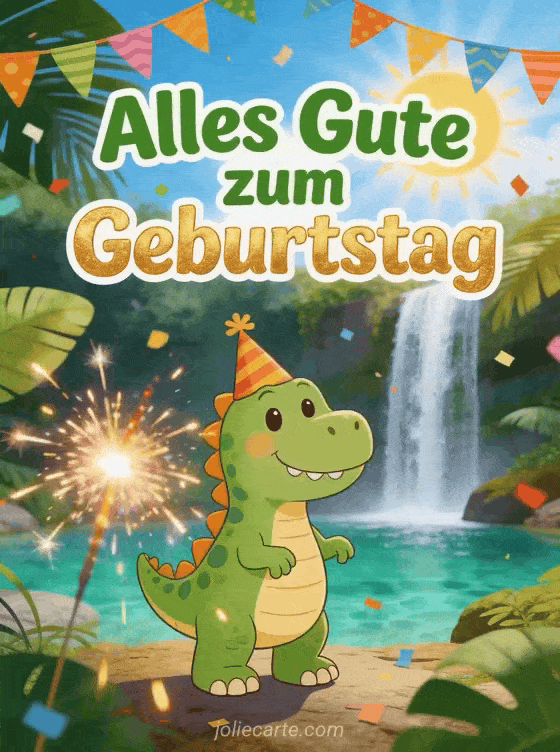 Teile eine fröhliche Botschaft mit dieser lebendigen Karte mit lächelndem Dinosaurier und tropischer Partydeko. Du kannst auch animierte Geburtstagskarte Kind, virtuelle kostenlose Geburtstagskarte Kind oder Geburtstagskarte Kind senden.