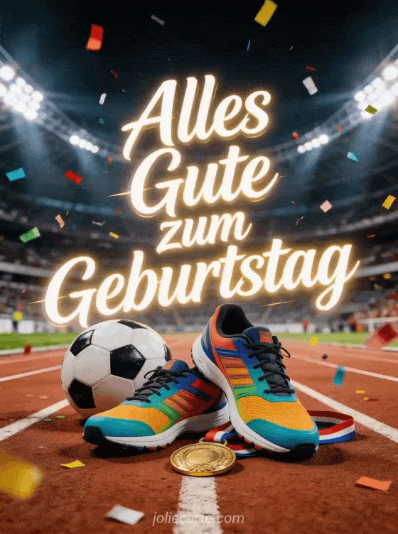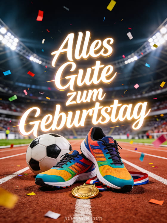Feiere mit dieser Geburtstagskarte Mann sportlich mit farbigen Laufschuhen auf der Laufbahn, Ball, goldener Medaille und Konfetti im dramatischen Stadionlicht. Entdecke auch alles gute zum geburtstag mann motorrad, geburtstagskarte mann liebe und geburtstagstext mann freund.