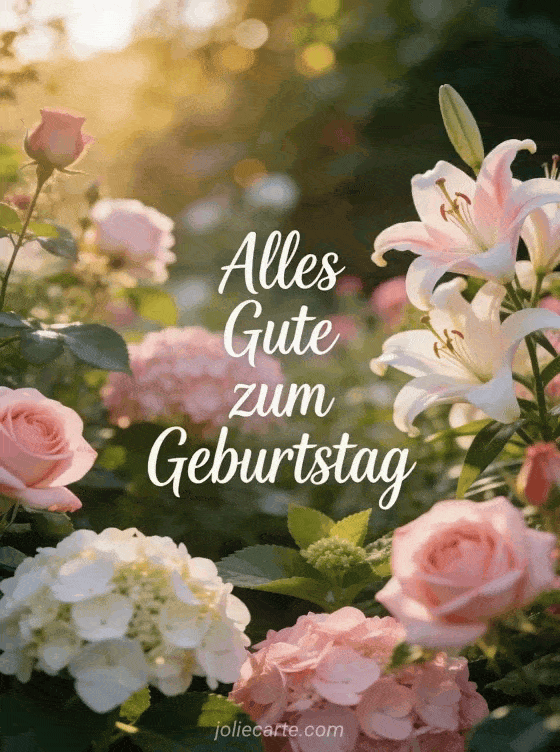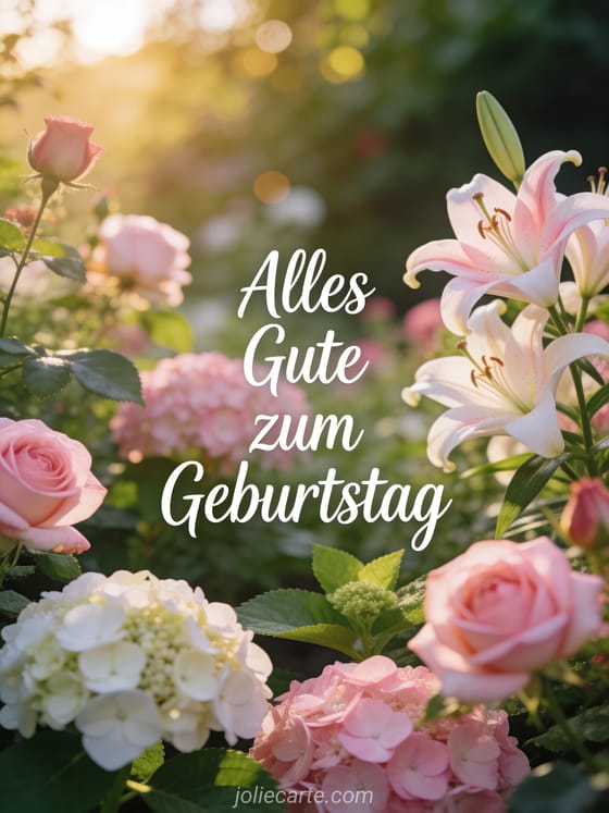 Verschicke diese atemberaubende Geburtstagskarte mit Rosen, Lilien und Hortensien in voller Blüte in einem üppigen Garten, getaucht in goldenes Nachmittagslicht mit einem wunderschönen natürlichen Bokeh-Effekt. Eine kostenlose fotorealistische Karte für sie. Entdecke auch Geburtstagsbilder für Frauen oder Geburtstagskarten für Frauen.