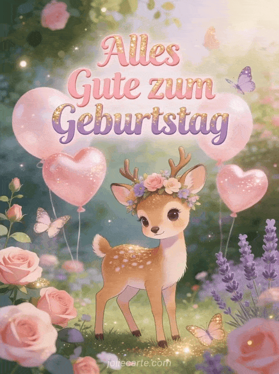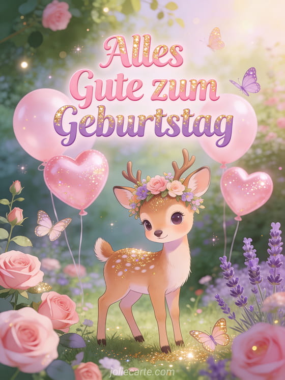 Versende diese bezaubernde Geburtstagskarte mit einem niedlichen Rehkitz mit Blumenkrone in einem magischen Garten voller Schmetterlinge und rosa Herzballons. Perfekt für den Geburtstag eines Mädchens. Entdecke auch eine Geburtstagskarte für Jungen oder eine Geburtstagskarten-Vorlage für Kinder.