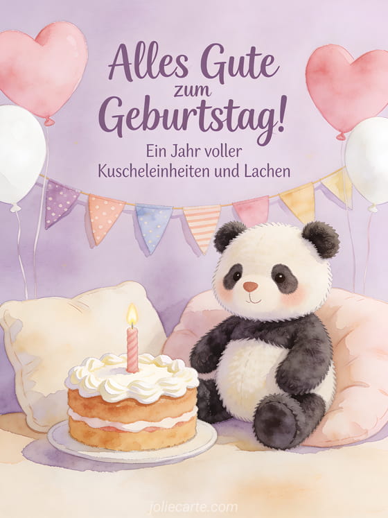Feiere das erste Jahr eines Babys mit einer sanften Illustration eines Plüschpandas auf einem weichen Kissen neben einem Geburtstagskuchen mit Kerze, bunten Wimpeln, rosa und weißen Herzballons und einem warmen Lavendelhintergrund. Entdecke auch Text zum ersten Geburtstag Baby, Alles Gute zum Geburtstag mein Baby oder Alles Gute zum Geburtstag mein einjähriges Baby.