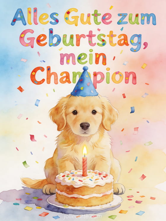 Senden Sie Ihrem Champion eine herzerwärmende Geburtstagsnachricht mit einem niedlichen Golden-Retriever-Welpen, einem blauen Partyhut, einer Torte mit Kerze und buntem Konfetti. Entdecken Sie auch Lachen ohne Freude, Text zum Geburtstag für meinen Enkel oder Geburtstag Enkel.