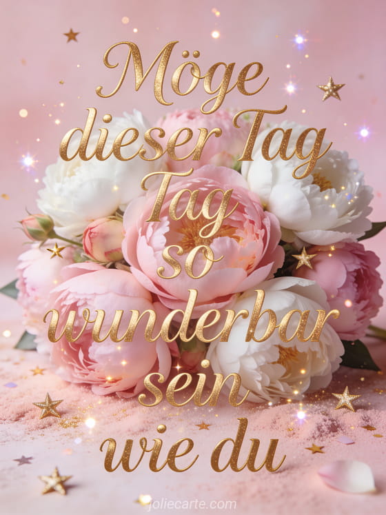 Feiern Sie den Geburtstag einer Freundin mit dieser fröhlichen Karte mit eleganten goldenen Buchstaben, einem prächtigen Strauß aus rosa und weißen Pfingstrosen umgeben von goldenen Sternchen und funkelndem Konfetti auf zartrosa Hintergrund. Entdecken Sie auch eine Freundschaftskarte mit Sonnenuntergang oder eine Freundschaftskarte mit Sternen.