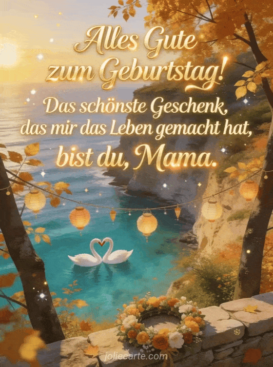 Feiere den Geburtstag deiner Mama mit dieser wunderschönen kostenlosen Karte mit einer poetischen herbstlichen Küstenszene, Schwänen und goldenem Licht. Eine liebevolle Art zu sagen, dass sie das schönste Geschenk ist. Entdecke auch eine berührende Geburtstagskarte für Mama oder eine Geburtstagskarte für die beste Mama.