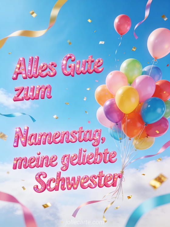Feiere den Namenstag deiner Schwester mit dieser farbenfrohen kostenlosen Karte. Bunte Helium-Ballons steigen in einen leuchtend blauen Himmel, Bänder wehen im Wind und goldene Konfetti. Entdecke auch eine Geburtstagskarte Schwester oder eine Geburtstagskarte Schwester Humor oder eine lustige Geburtstagskarte Schwester.