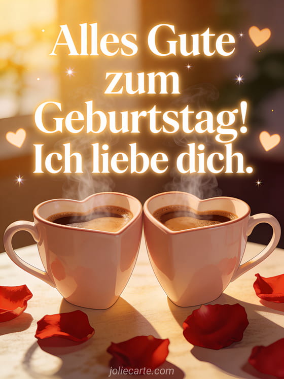 Sagen Sie âIch liebe dichâ mit dieser wunderschönen Geburtstagskarte. Zwei herzförmige Kaffeetassen und rote RosenblĂ€tter schaffen eine intime und liebevolle AtmosphĂ€re. Entdecken Sie auch eine humorvolle Geburtstagskarte oder eine Geburtstagskarte mit Champagner.