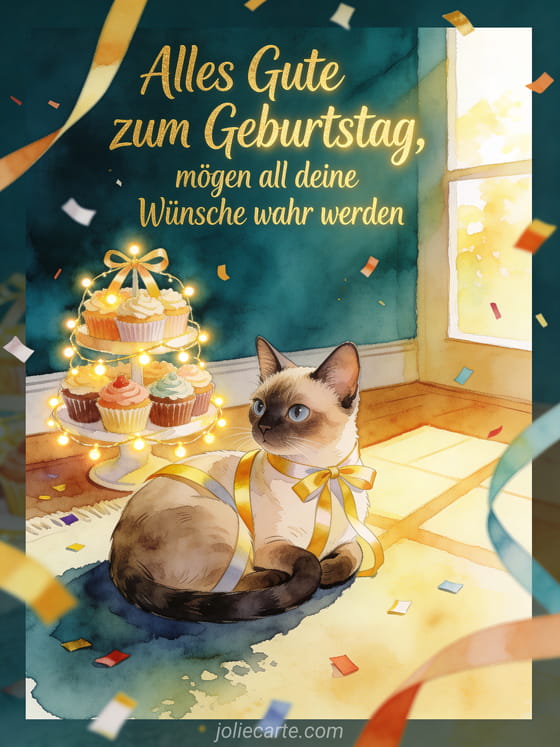 Teile eine gemütliche Aquarell-Geburtstagskarte mit einer Exotic-Shorthair-Katze, die neben einem mit Bändern geschmückten Cupcake-Turm und leuchtenden Girlanden in einem sonnigen Zimmer liegt, mit Konfetti und Luftschlangen. Entdecke auch eine Geburtstag des Sohnes, ein alles Gute zum Geburtstag mein Sohn gifs oder eine kostenlose Geburtstagskarte für meinen Sohn.