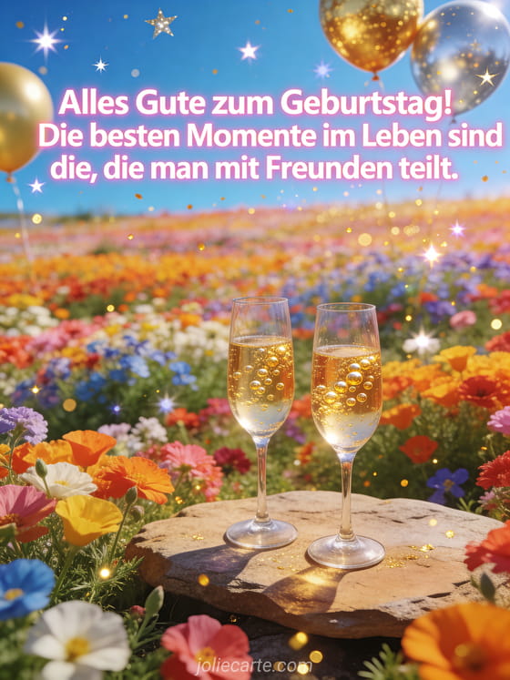 Alles Gute zum Geburtstag! Die besten Momente teilt man mit Freunden. eine festliche Geburtstagskarte mit einem Wildblumen-Superbloom und Champagner
