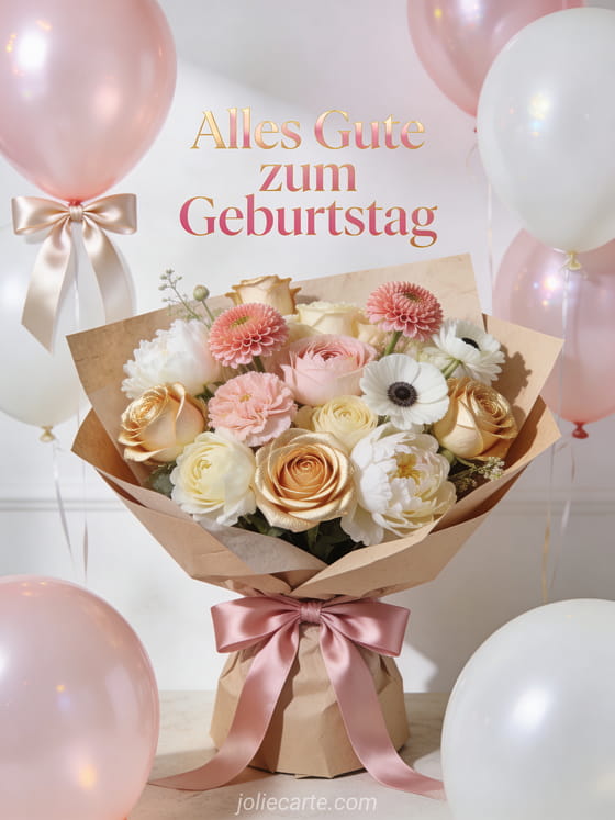 Feiern Sie ihren Geburtstag mit einem luxuriösen Strauß aus rosa Ranunkeln, weißen Pfingstrosen und Anemonen in Kraftpapier mit Satinschleife, umgeben von rosa und weißen Ballons. Entdecken Sie auch eine Geburtstag Frau Blumen oder eine Geburtstagskarte Frau Aquarell.