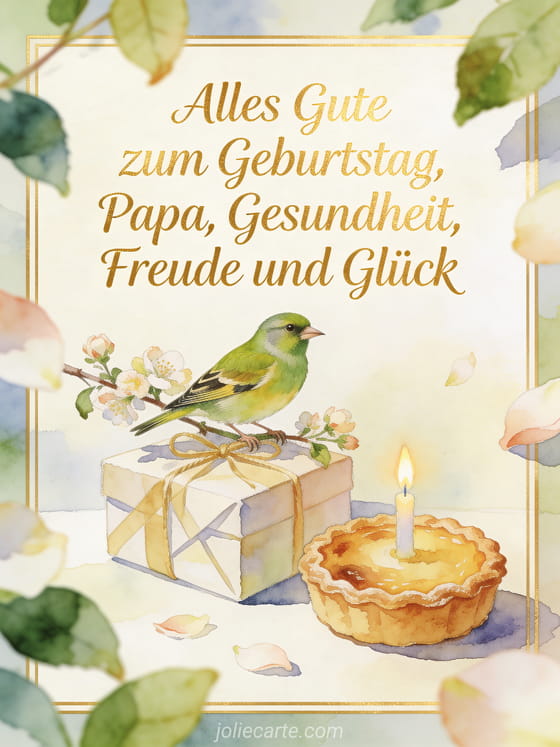 Teile einen Geburtstagstext für deinen Papa mit einem Gruenfink auf blühenden Zweigen über einem verpackten Geschenk und einer Tarte mit Kerzenlicht. Dazu passen alles gute zum geburtstag papa gif, väter alles gute zum geburtstag papa berührender text oder alles gute zum geburtstag papa fotomontage.