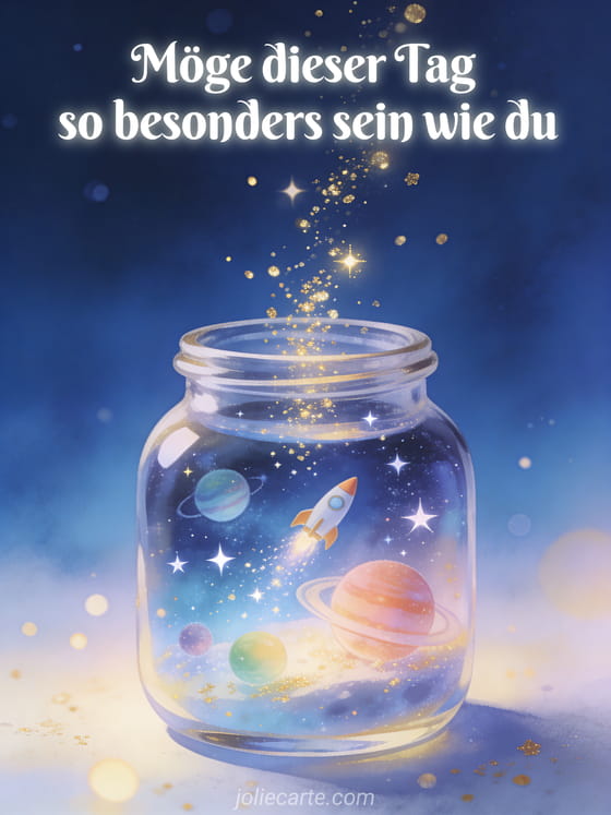 Senden Sie einen traumhaften Geburtstagstext für Ihren Enkel mit einem Glas, das ein kleines Universum aus bunten Planeten, funkelnden Sternen und einer Rakete enthält. Entdecken Sie auch Geburtstag Enkel, Geburtstagsnachricht Enkel oder Alles Gute zum Geburtstag mein Enkel.