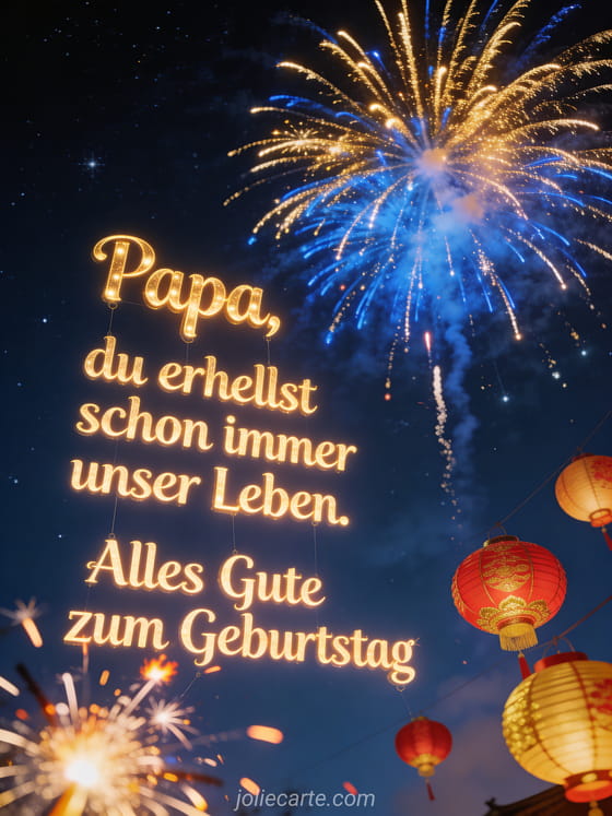 Teile einen Geburtstagstext für seinen Papa mit leuchtender goldener Schrift, strahlendem goldenem und blauem Feuerwerk, schwebenden roten und goldenen Laternen und einem festlichen Nachthimmel. Entdecke auch eine lustig alles Gute zum Geburtstag Papa witzig, eine Kinderzeichnung Geburtstag Papa oder ein Alles Gute zum Geburtstag Papa Bild.