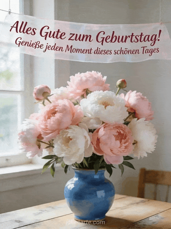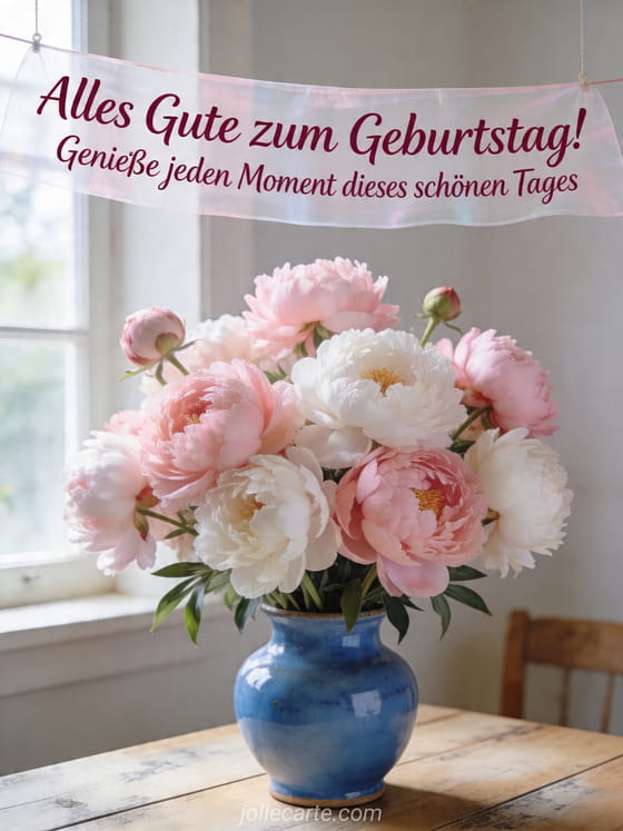 Teile eine elegante Geburtstagsbotschaft mit dieser stilvollen Karte mit rosa und weißen Pfingstrosen in einer blauen Keramikvase. Entdecke auch Nachricht um alles Gute zum Geburtstag zu wünschen, Text für Geburtstag und Text Geburtstagskarte.