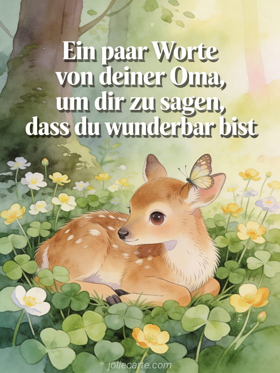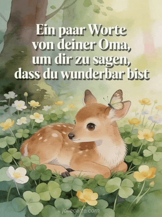 Teile poetische Geburtstagsworte von Oma mit einem sanften Kitz, das zwischen Klee und Gänseblümchen ruht, einem Schmetterling am Ohr und weichem Waldlicht. Entdecke auch eine Vorlage Geburtstagskarte für meine Enkelin, eine Alles Gute zum Geburtstag Karte meine Enkelin oder eine Alles Gute zum Geburtstag für meine Enkelin Karte.