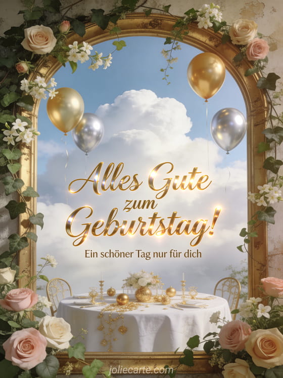 Sende wunderschöne Geburtstagsworte, um jemandes besonderen Tag zu verschönern. Ein goldener Rahmen mit Rosen, Jasmin und goldenen Ballons schafft eine herzliche festliche Atmosphäre. Entdecke auch Alles Gute zum Geburtstag voller Glück oder Geburtstag girly.