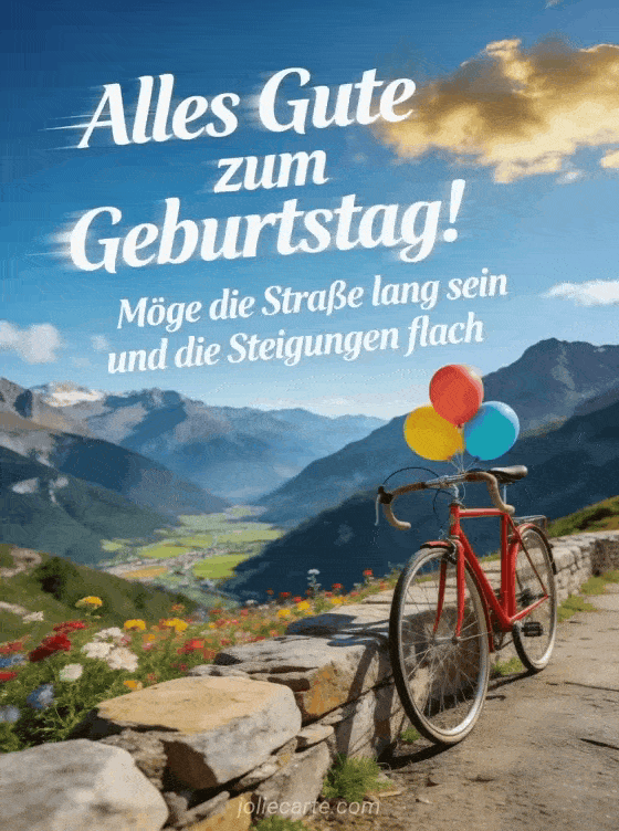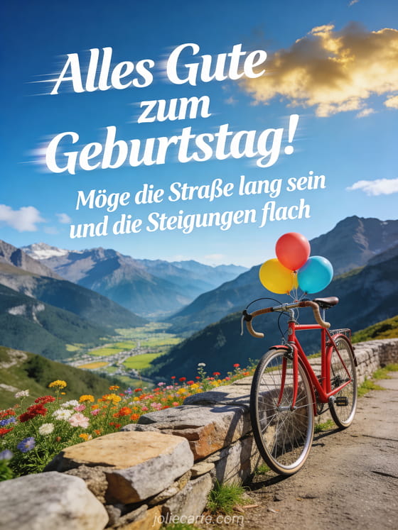 Senden Sie diesen lustigen Geburtstagswunsch für Radfahrer mit einem roten Vintage-Rennrad an einem spektakulären Bergpass. Entdecken Sie auch einen witzigen Geburtstagsspruch oder einen witzigen Geburtstagstext.