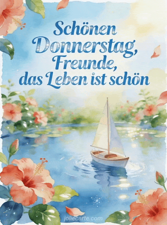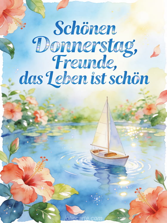 Teile einen freundlichen Donnerstagsgruß mit ozeanblauer Schrift, perligen Lichtern, einem kleinen Segelboot auf einem hellen See, Hibiskusblüten, glänzenden Blättern, Sonnenwellen und weichem Glitzer. Dazu passen auch ein Schönen Donnerstag Bild GIF, ein Schönen Donnerstag glitzerndes Bild oder ein Guten Morgen schönen Donnerstag animiertes GIF.