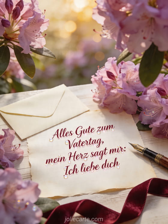 Sende ein poetisches Gedicht zum Vatertag mein Herz sagt mir mit einem fotorealistischen Schreibtisch-Stillleben, Füller, versiegeltem Briefumschlag, blühenden Rhododendronbüscheln und Samtschleife. Entdecke auch Vatertag Zeichnung, eine virtuelle Vatertagskarte oder die beste Vatertagskarte.