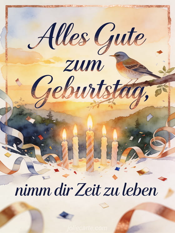 Sende eine ruhige Geburtstagsbotschaft mit einer Drossel auf einem Zweig über leuchtenden Kerzen. Schleifen, Konfetti und ein goldener Aquarellwald schaffen eine friedliche Feier rund um den Wunsch, sich Zeit zum Leben zu nehmen. Entdecke auch Geburtstagsgedicht für meinen Sohn, Geburtstagsgedicht für meinen Sohn oder Alles Gute zum Geburtstag mein erwachsener Sohn.