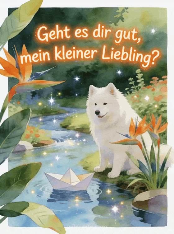 Frage mit spielerischer Wärme durch orangefarbene Schrift, Strelitzien, einen Samojeden neben einem gefalteten Papierboot und einen glitzernden Gartenfluss. Entdecke auch eine Guten Morgen mein Schatz wie geht es dir heute Morgen, eine wie geht's dir Liebste Karte oder einen Gruß mit ja es geht gut mein Schatz.