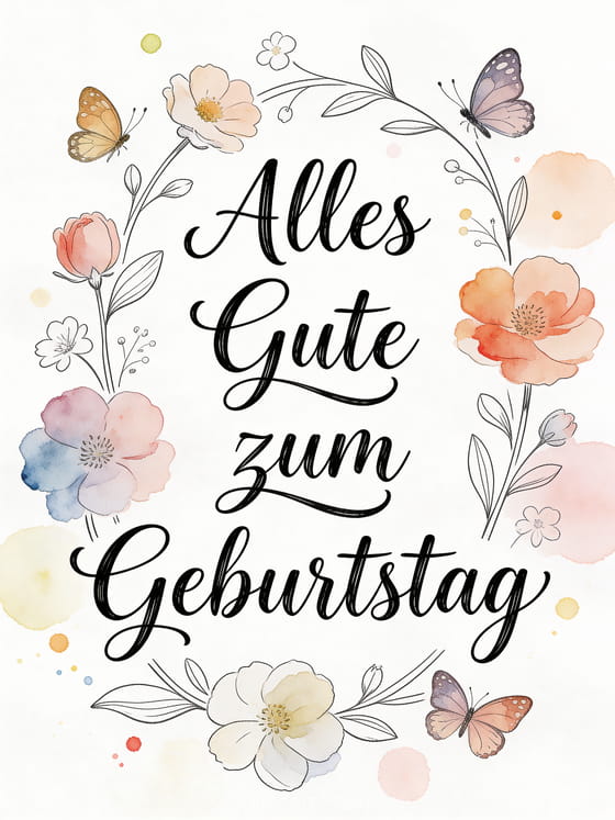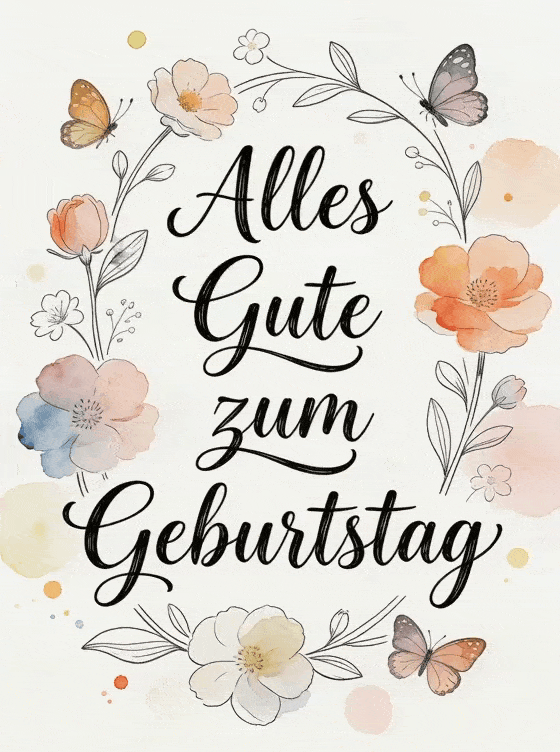 Sende diese zarte gezeichnete Geburtstagskarte für Frauen mit feinen Blumen und Schmetterlingen in Aquarellfarben. Entdecke auch eine Geburtstagskarte Frau lustig kostenlos oder eine animierte Geburtstags-GIFs für Frauen.