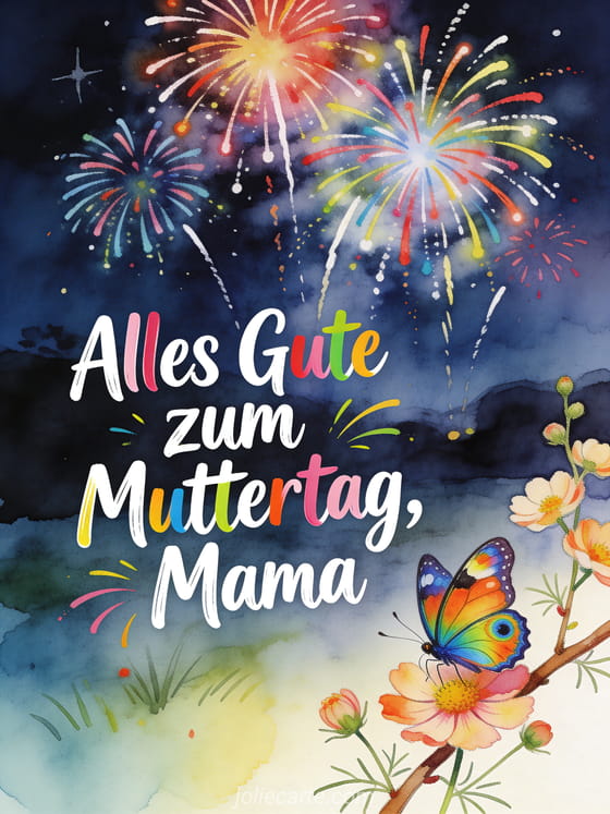 Senden Sie diese kreative handgezeichnete Muttertagskarte mit einer verspielten Feuerwerksszene und Schmetterling in einem Cosmos-Garten. Entdecken Sie auch Muttertag Karten kostenlos oder heute ist Muttertag.