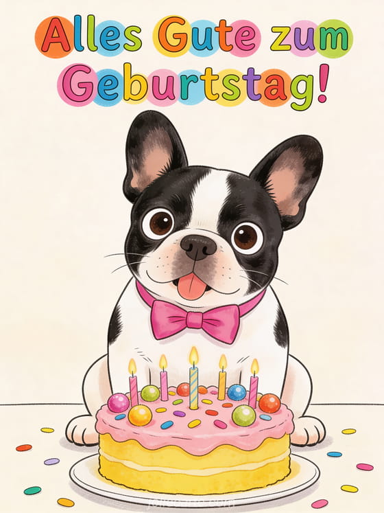 Schenke ein Lächeln mit dieser humorvollen Geburtstagskarte mit französischer Bulldogge und dekorierter Torte. Entdecke auch Geburtstag Frau Humor gif, Geburtstagskarte Frau schön und Geburtstagskarte Frau Strand.