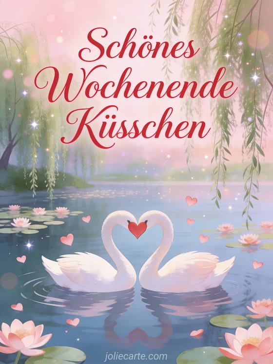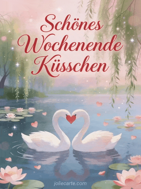 Teile einen zärtlichen animierten Gruß mit zwei Schwänen, die ein Herz zwischen Seerosen bilden. Entdecke auch eine schönes Wochenende Bilder Karte oder eine schönes Wochenende euch allen Karte.