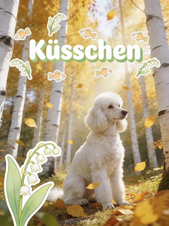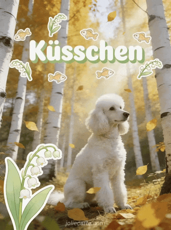 Teile süße Küsschen mit dieser charmanten Herbst-Grußkarte mit einem weißen Pudel und Maiglöckchen. Entdecke auch küsschen senden oder karte dicke küsse für mehr zärtliche Grüße.