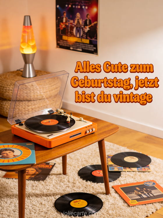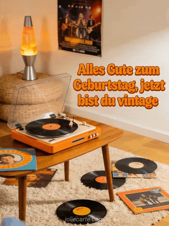 Teile diese Retro-Geburtstagskarte mit Plattenspieler, Vinyls und humorvollen Anspielungen aufs Alter. Entdecke auch alles gute zum geburtstag mann humor gif, schöne Geburtstagskarte Mann und schöne kostenlose Geburtstagskarte Mann Dromedar.