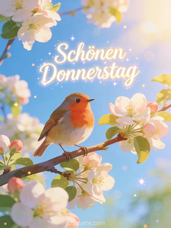 Versüße jemandem den Donnerstag mit dieser sonnigen animierten Karte mit einem süßen Rotkehlchen auf Apfelblüten. Entdecke auch guter Donnerstag Küsse oder guten Donnerstag im Regen.